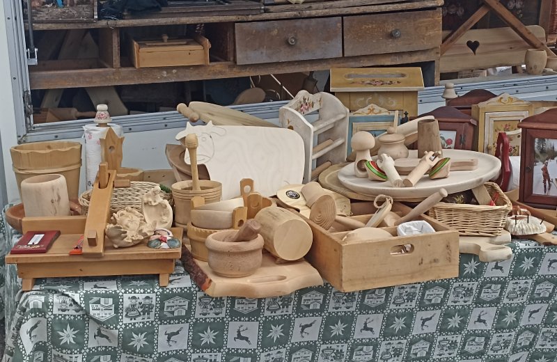 Oggetti in legno lavorato: 2 vassoi 30x50cm, 6 vasi diametro da 15 cm a 20 cm, cassetta 40x60cm, 3 vassoi diametro 50cm, mastello per burro diametro 20cm, porta oggetti 30x15x40cm, porta insaccati 45x60x10cm, 3 schiaccia noci, 2 cestini di vimini 25x35cm, 2 porta scottex, 6 bicchieri, 2 giochi-trottole, cassetta porta chiavi 20x30cm, 4 forme per pasta da dolci, 2 vassoi di forma irregolare circa 30x40cm.